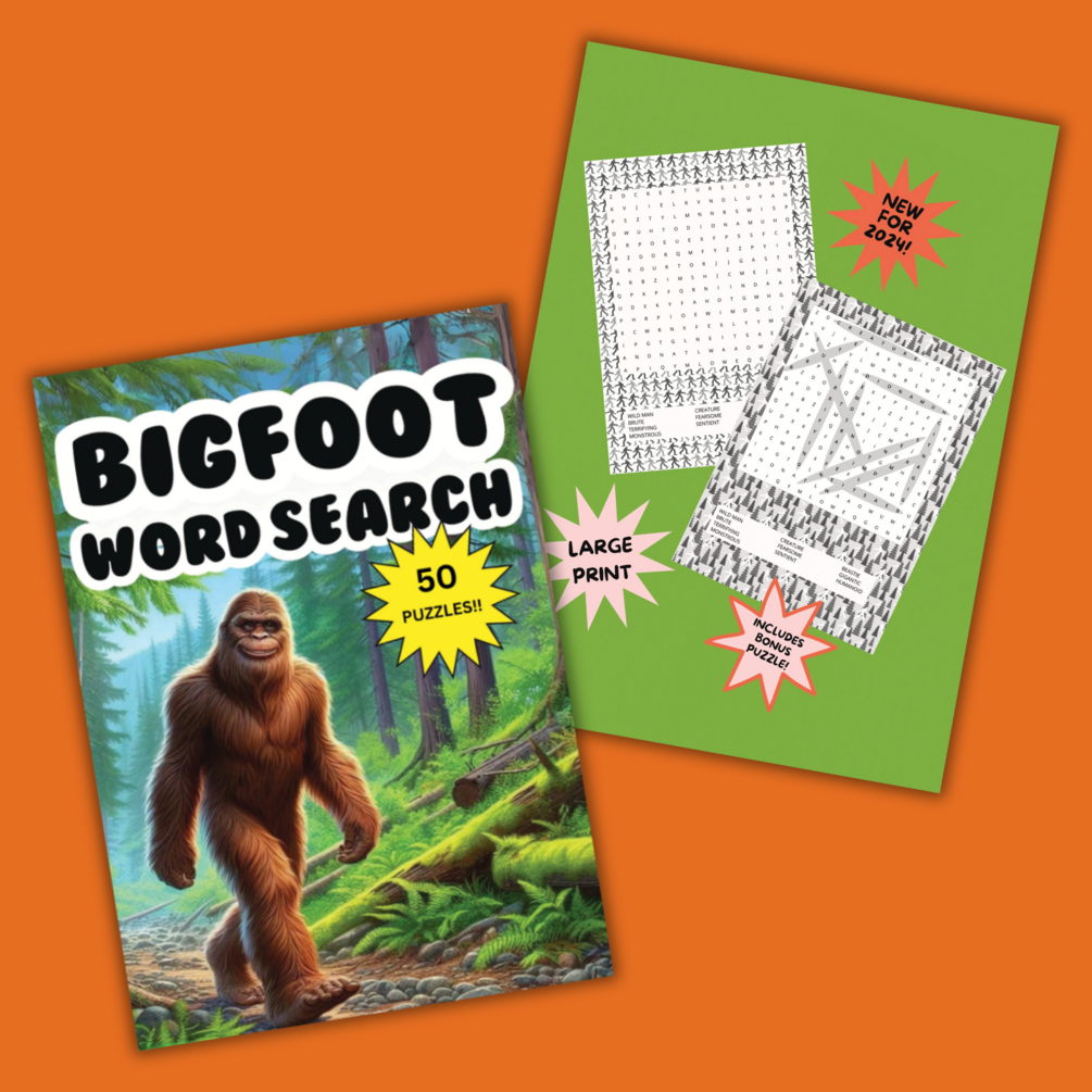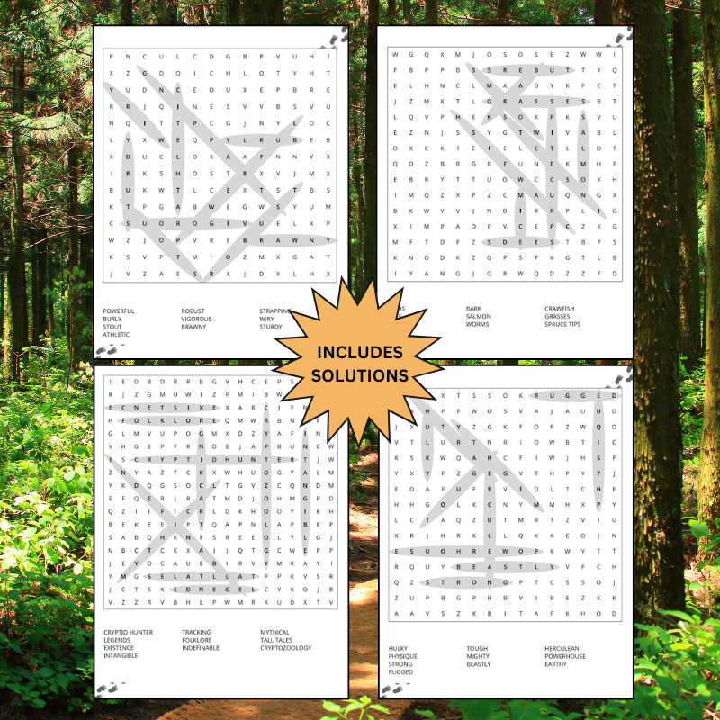 Over 50 word searches tailored for fans of Bigfoot, Sasquatch, Yeti and Grassman.