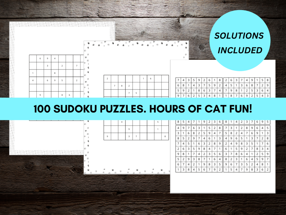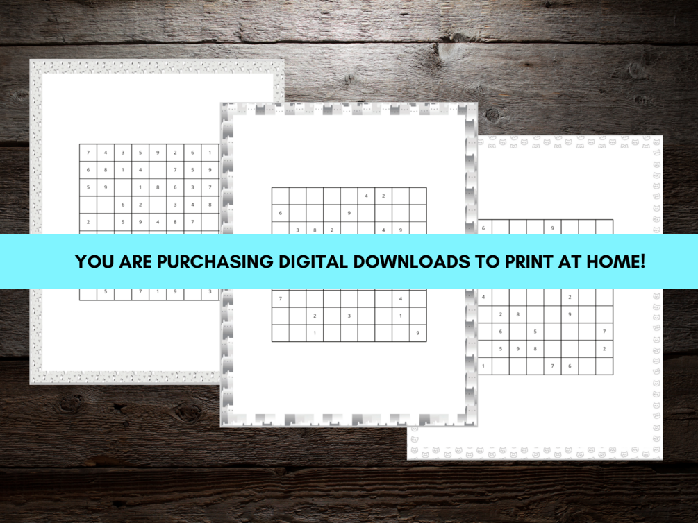INSTANT DIGITAL DOWNLOAD FILES. Are you ready to purr-fect your puzzling skills with our meow-nificent Cat Sudoku Book Digital Download? Each puzzle page features cute, cat-themed borders. Solutions included.