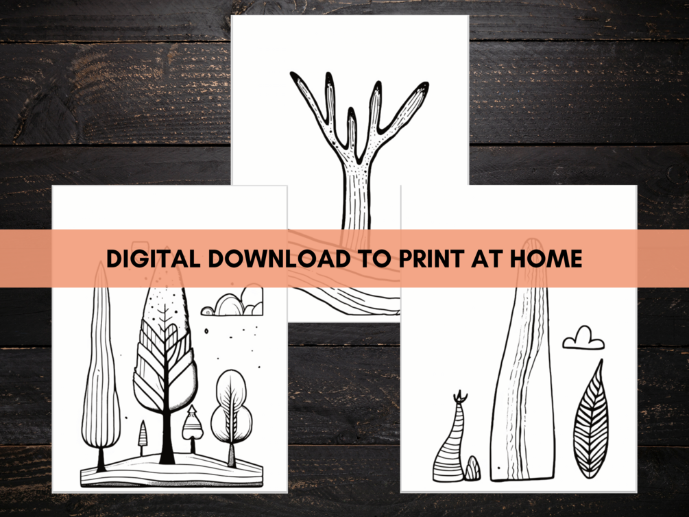 New for 2024! Wonky Trees Coloring Pages Digital Download for Children, Adults and Seniors. 8.5x11" Size Pages for you to Print.
