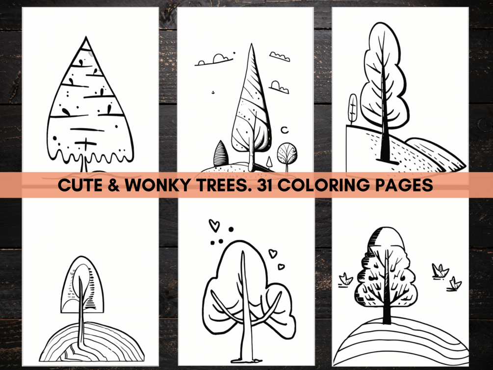 Cute and Wonky Trees Digital Download. Playful, Easy Coloring Book for Relaxation. Large Print, Strong Lines. 31 Images to Print and Color.